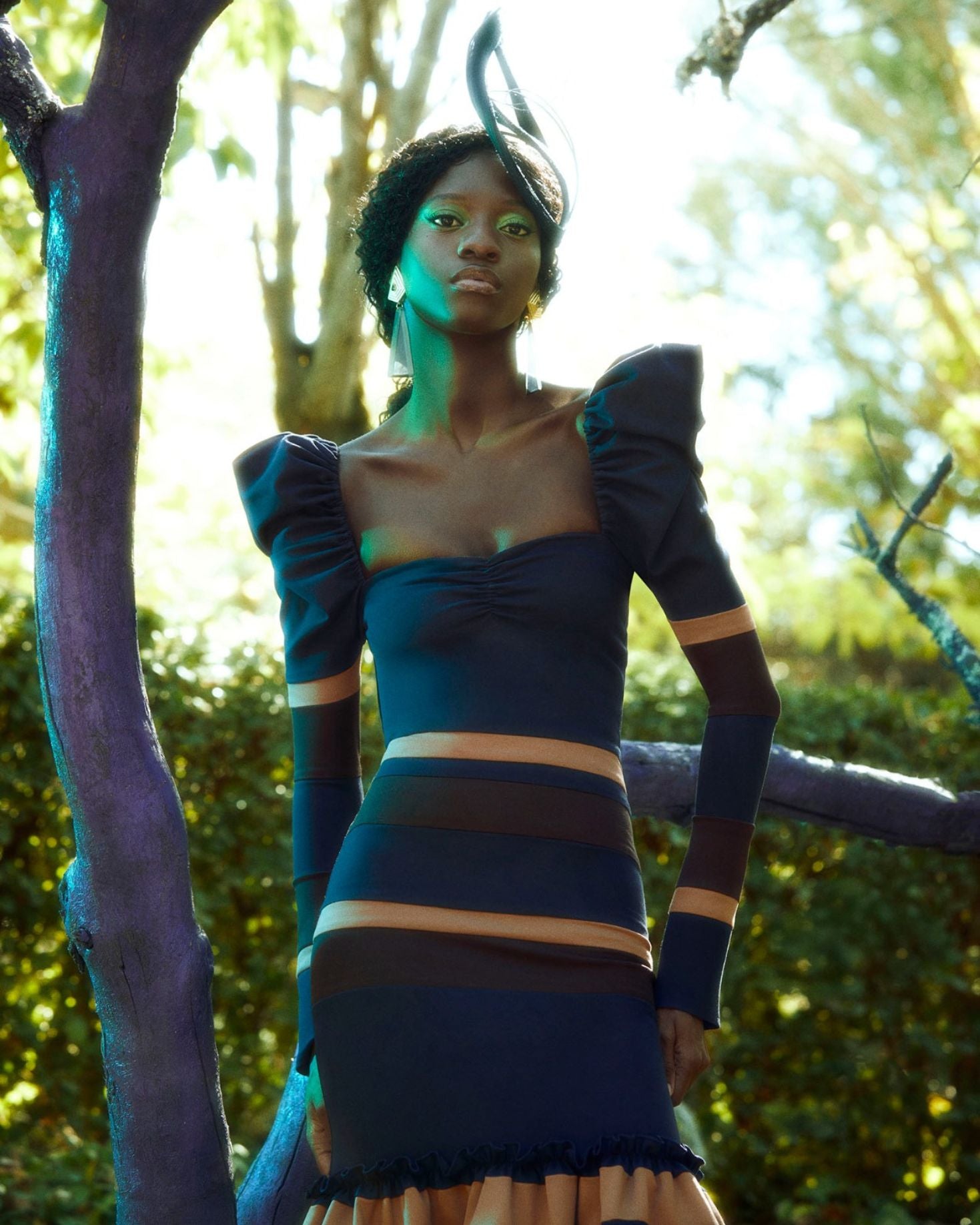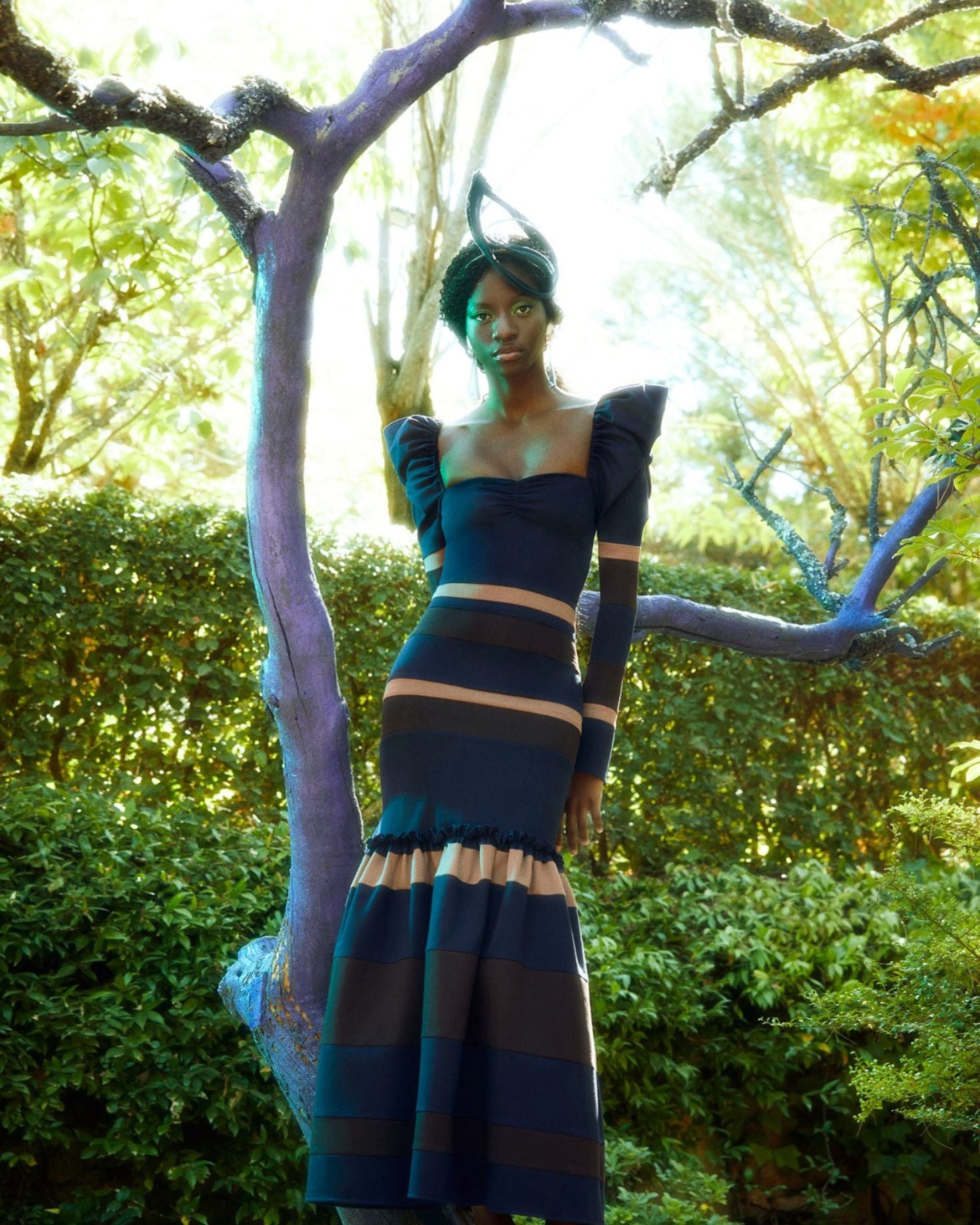 Vestido de punto elástico a rayas en tonos oscuros que abraza la silueta y finaliza en falda sirena. Mangas estructuradas, presencia magnética y una oscuridad que no pide perdón. La moda como poder y reivindicación.