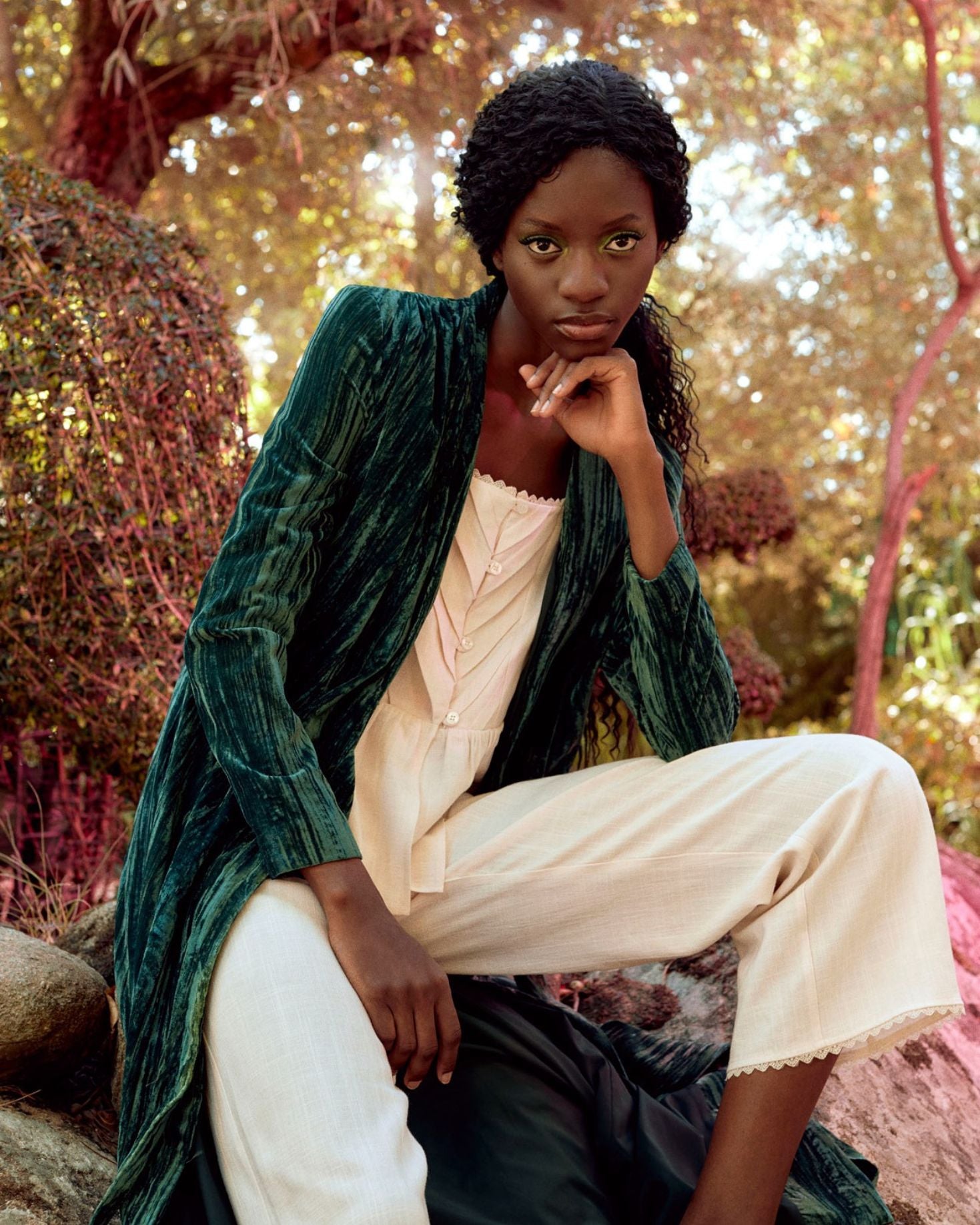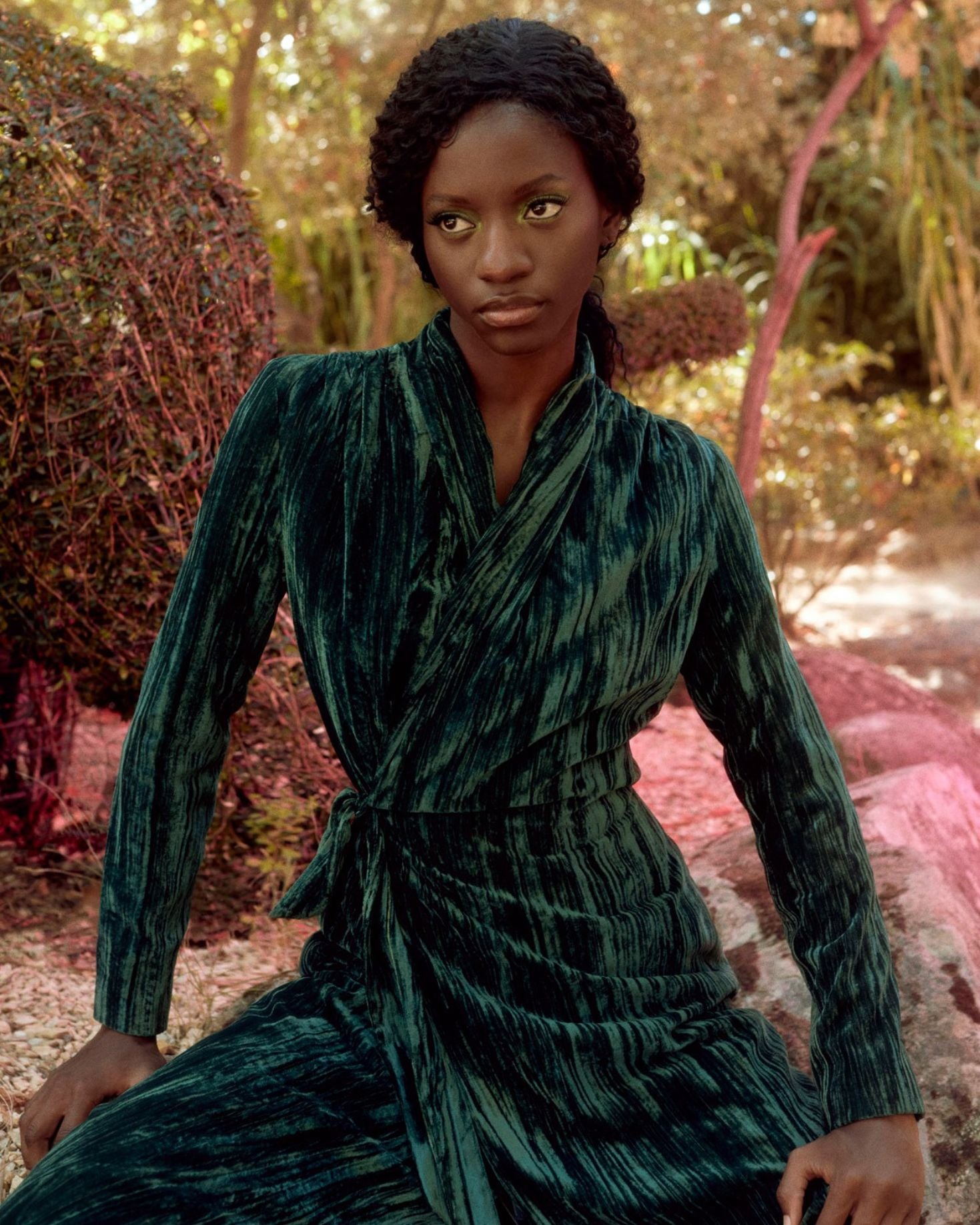 Conjunto de terciopelo verde oscuro con efecto hipnótico y corte envolvente. Elegante, profundo, misterioso: descanso para almas indomables.