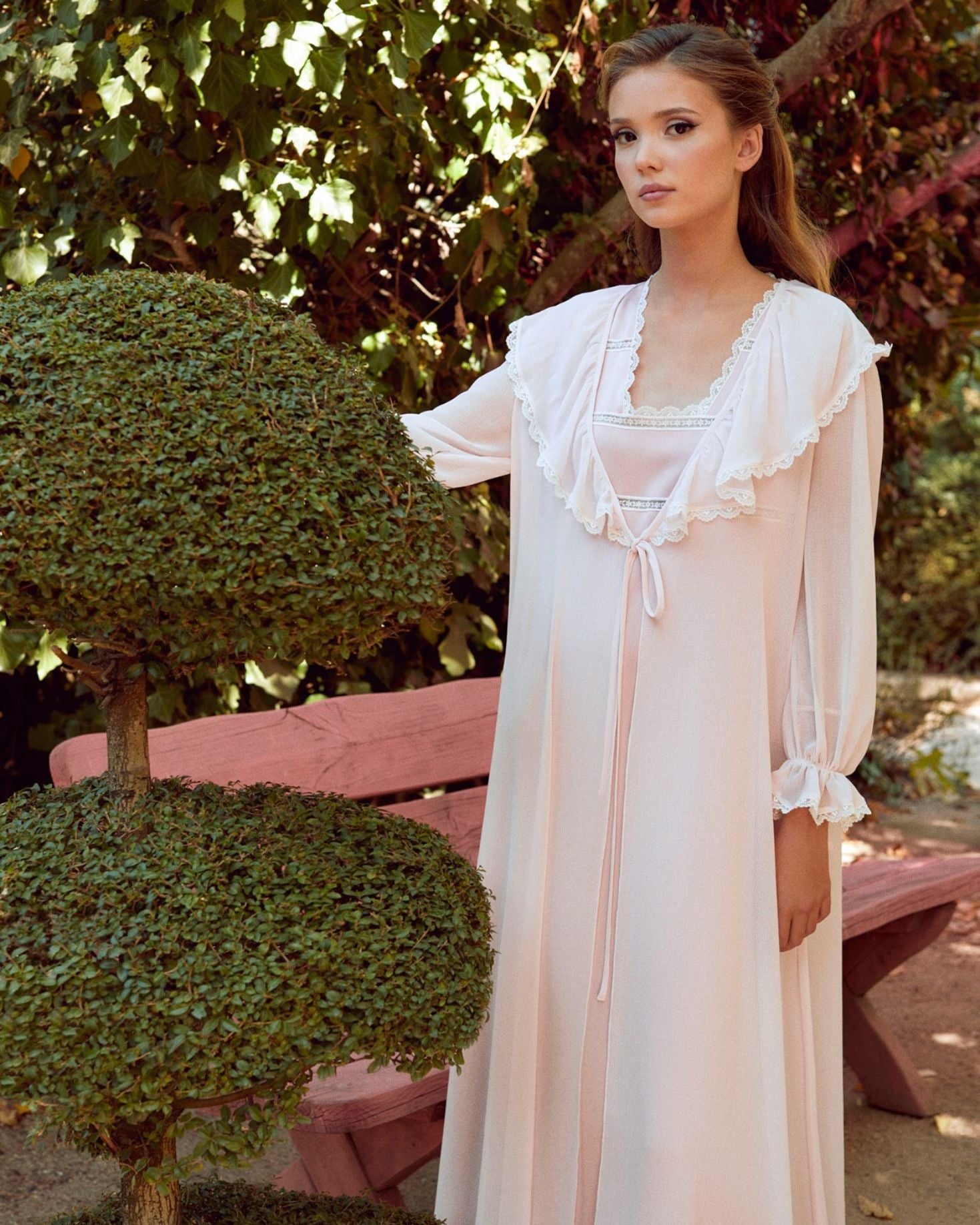 Camisón largo en rosa empolvado con encajes y volantes delicados. Suave, fantasioso y romántico: una noche envuelta en luz pastel.