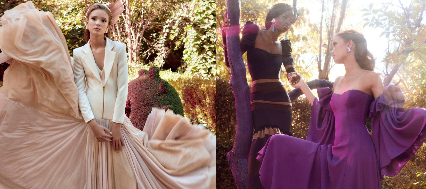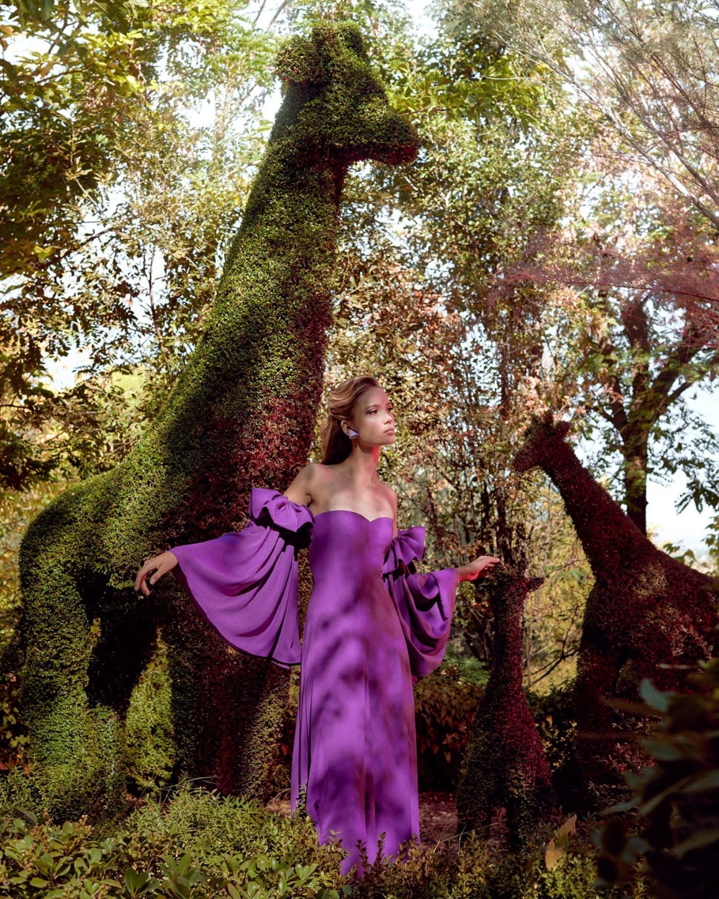 Vestido largo en tono orquídea intenso, con escote corazón y mangas abullonadas que caen en forma de alas fluidas. Su movimiento etéreo y su color radiante evocan la delicadeza luminosa de Glinda, símbolo de esperanza y equilibrio.