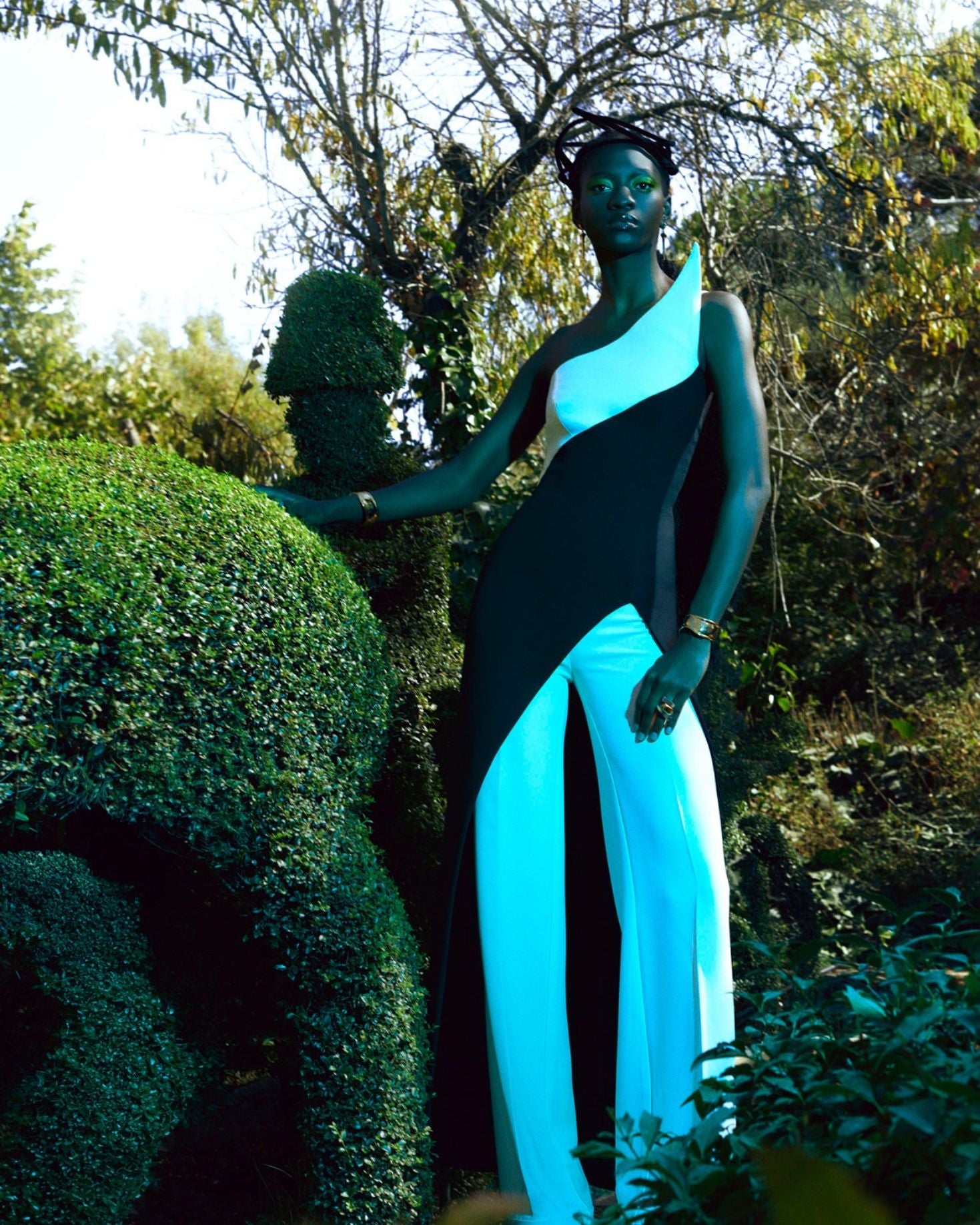 Diseño con cuerpo asimétrico y juego geométrico de contrastes que se prolonga en un pantalón blanco de caída recta. Un look gráfico y rotundo que traduce la dualidad de Elphaba: intensidad, intelecto y disidencia visual.