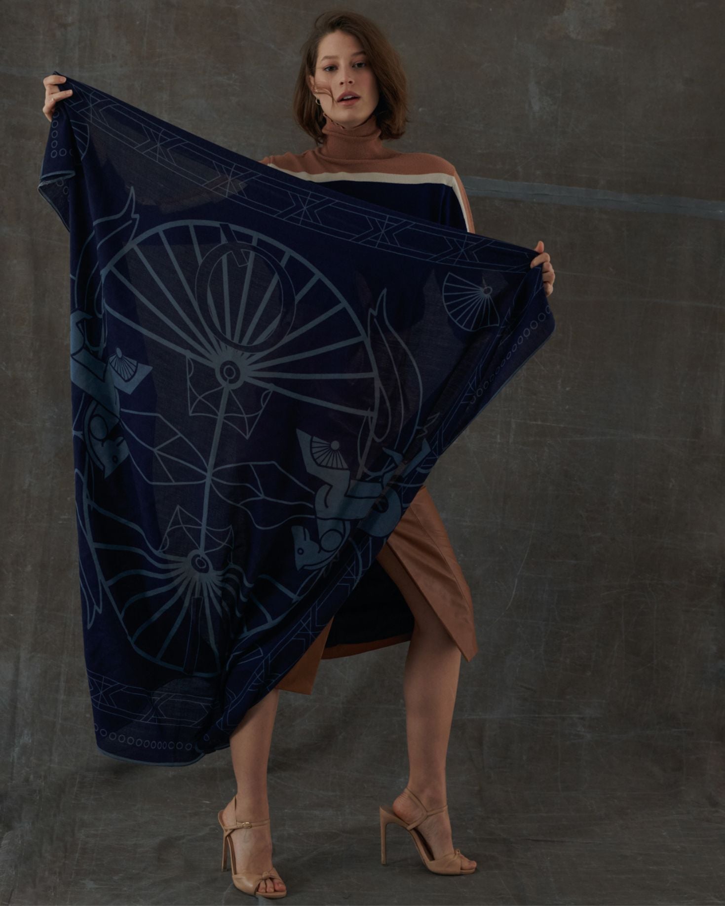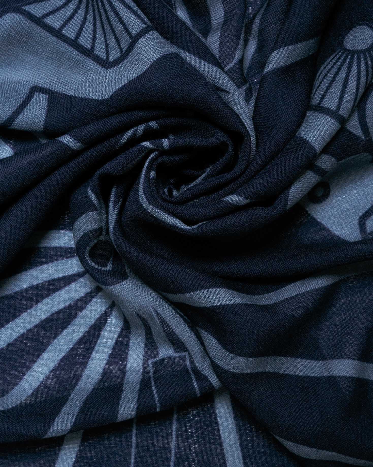 Fular de 100% lana con estampado en tono azul grisáceo. Las medidas son de 140 x 140.