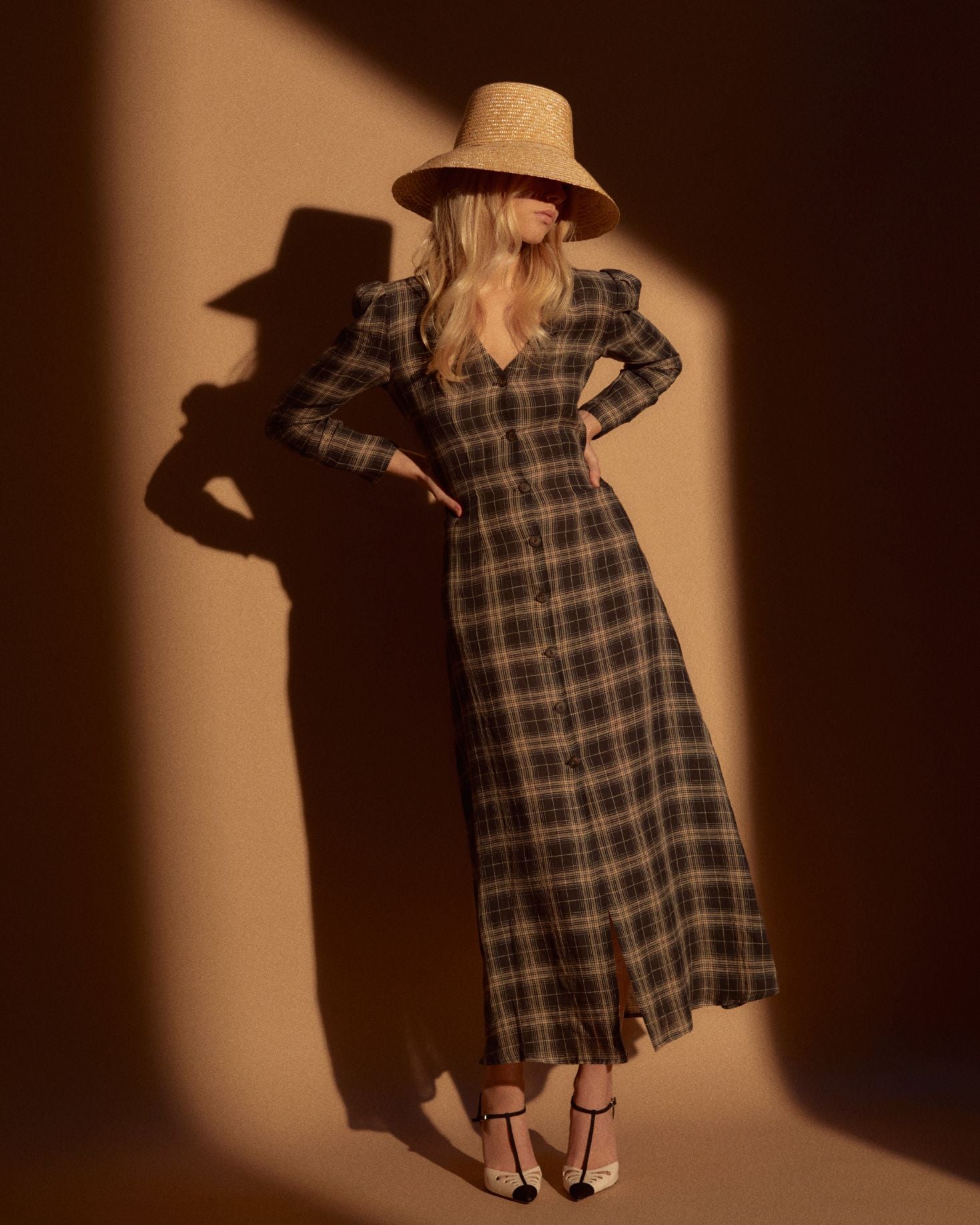Vestido midi de lino con escote a la caja, y manga abullonada. Cierre delantero con botones.