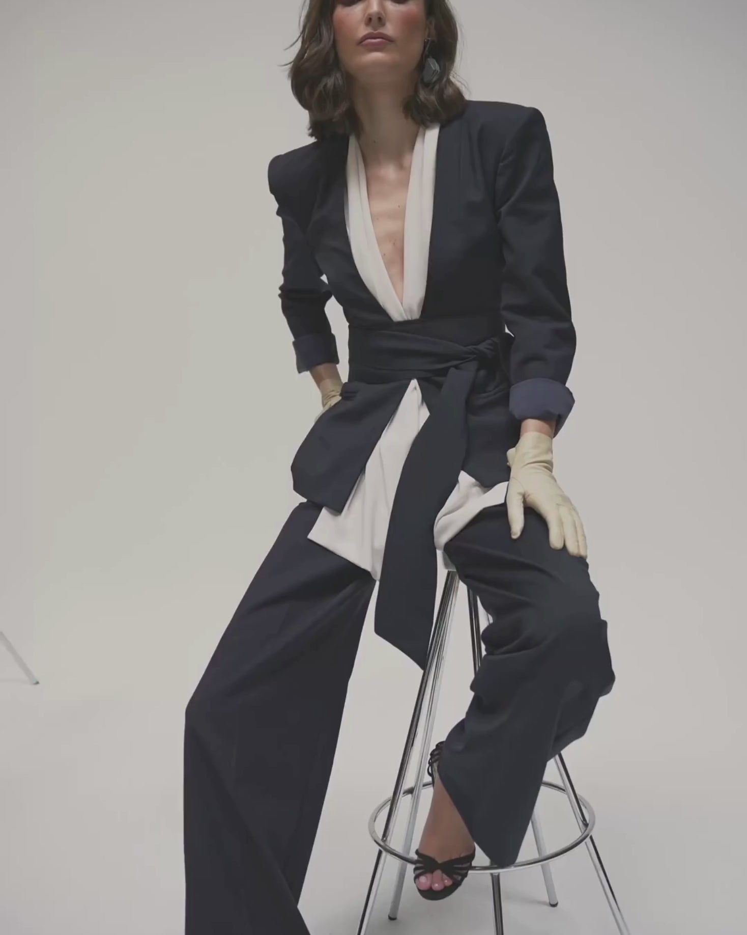 Chaqueta bicolor en color azul marino y blanco. Manga larga. Cierre delantero con corchete invisible.