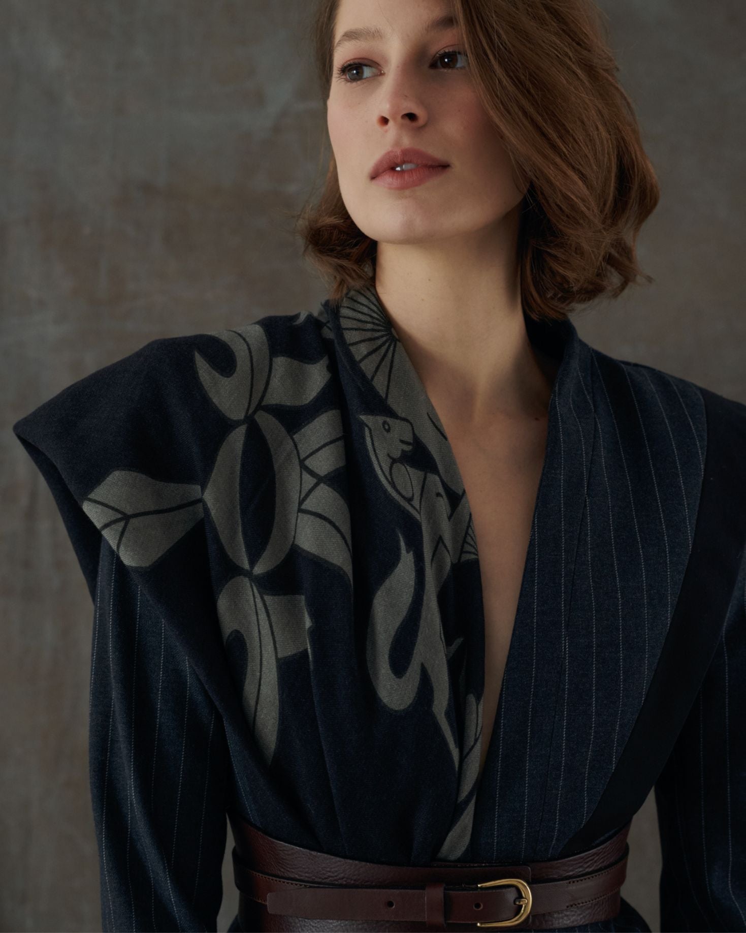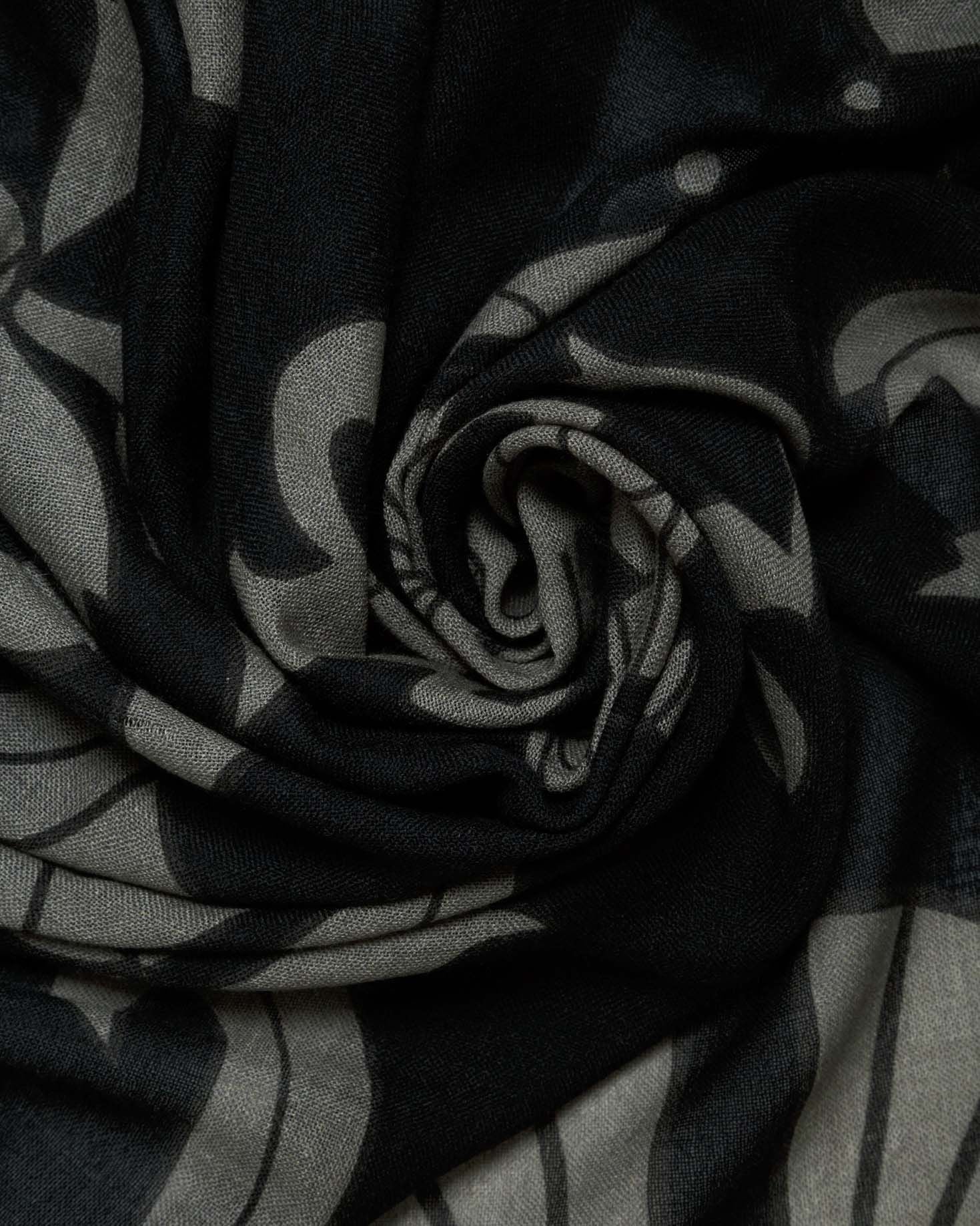 Fular de 100% lana con estampado en tonos negro y gris. Las medidas son de 140 x 140. También disponible con estampado en color verde.